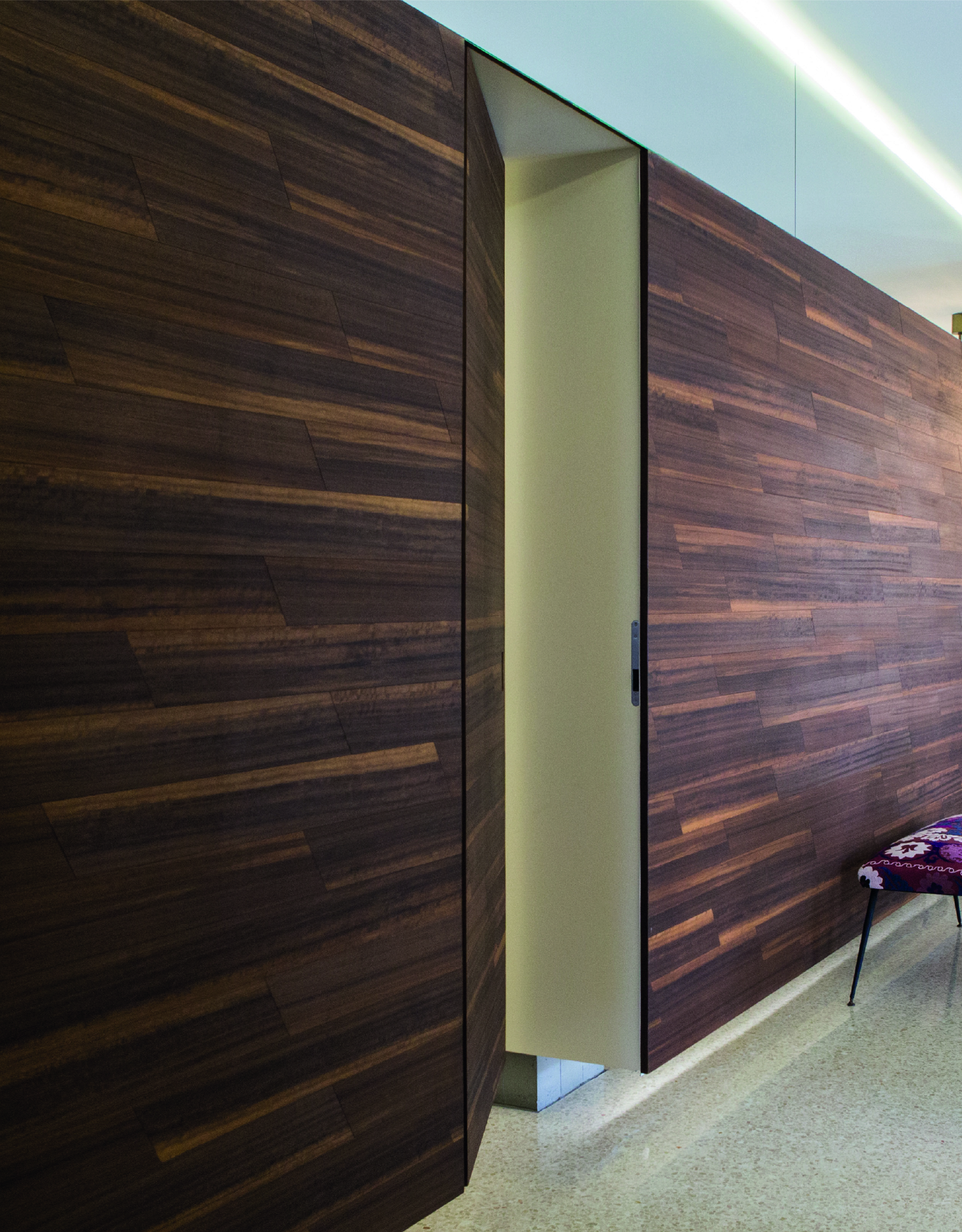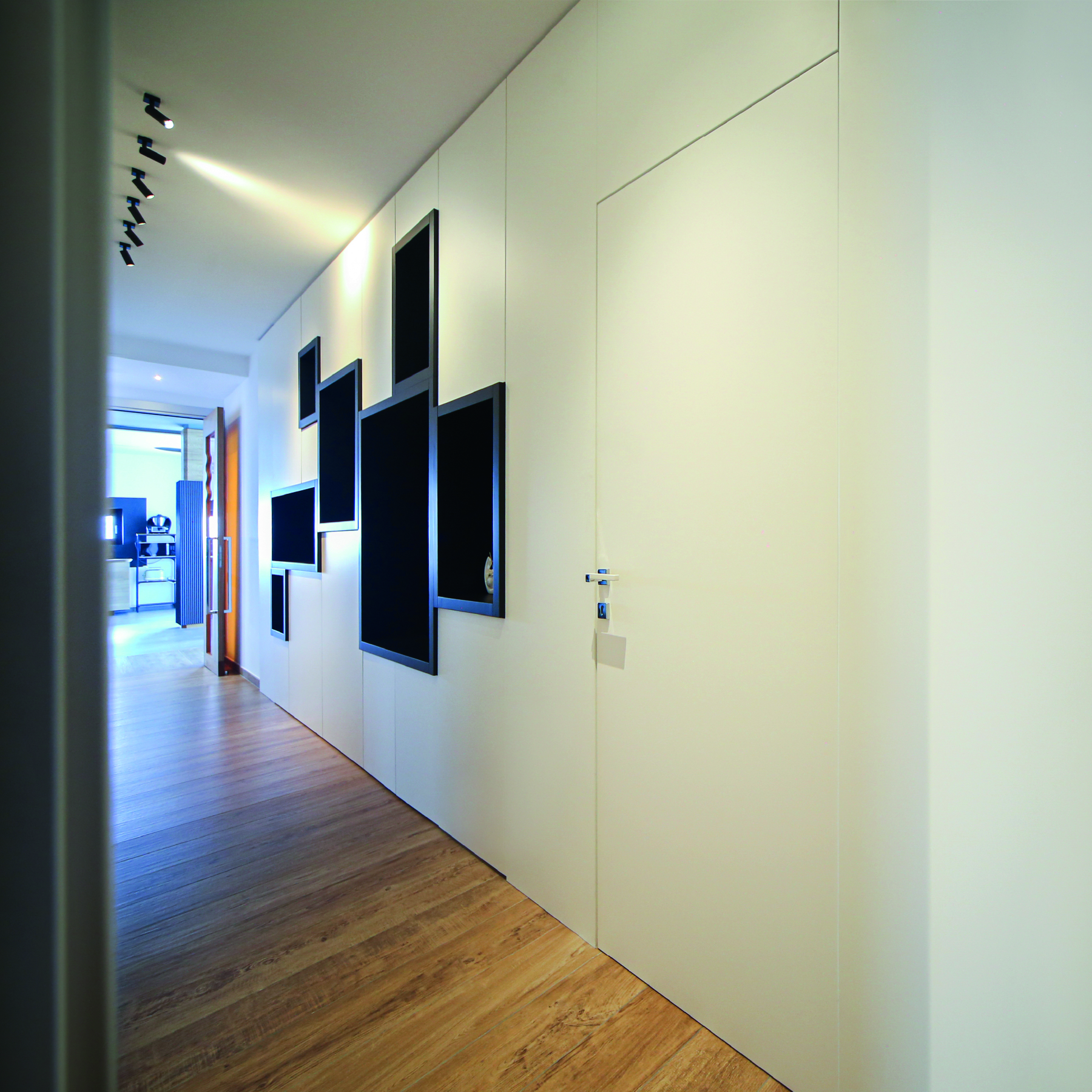 Le caratteristiche esclusive dei pannelli porta sono il risultato di una progettazione appositamente concepita per le diverse tipologie di apertura, evitando la produzione di prodotti standard adattati successivamente. Quest’attenzione, combinata alle lavorazioni in azienda di telai e coprifili, permette di evitare approssimazioni e inestetismi, che spesso caratterizzano altri prodotti presenti sul mercato. Un esempio eclatante è quello delle porte scorrevoli a scomparsa, che presentano differenze di altezza tra vano passaggio e coprifili rispetto alle battenti; inoltre il disegno dell’anta perde la sua geometria e simmetria essendo nascosto dietro al telaietto.