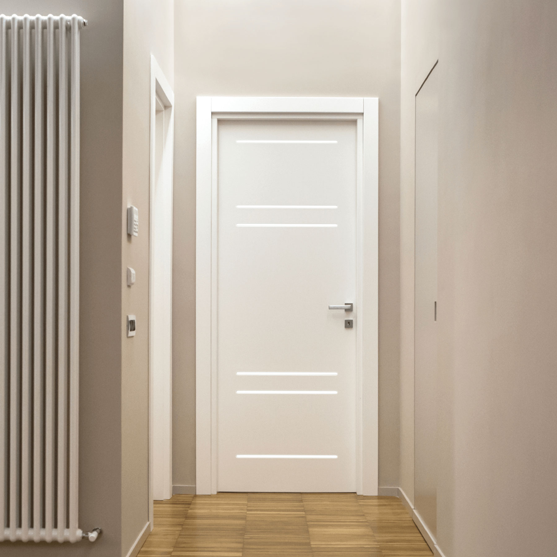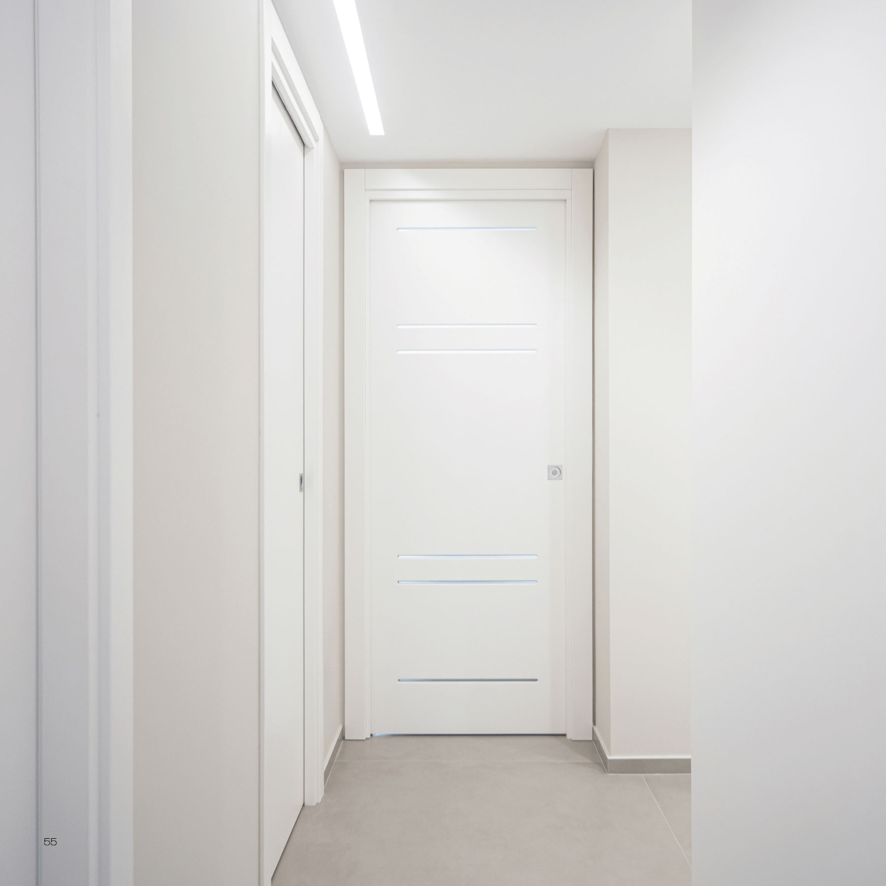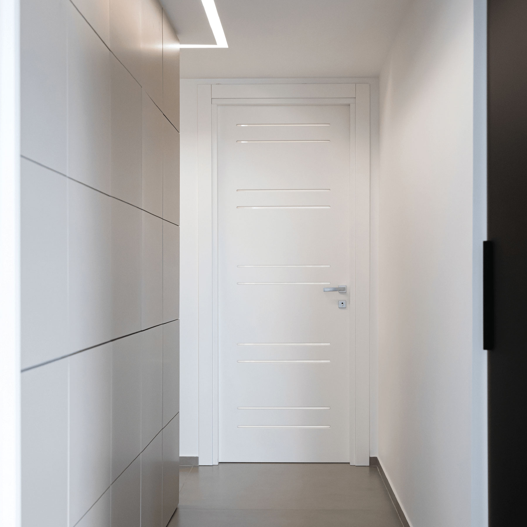 Le caratteristiche esclusive dei pannelli porta sono il risultato di una progettazione appositamente concepita per le diverse tipologie di apertura, evitando la produzione di prodotti standard adattati successivamente. Quest’attenzione, combinata alle lavorazioni in azienda di telai e coprifili, permette di evitare approssimazioni e inestetismi, che spesso caratterizzano altri prodotti presenti sul mercato. Un esempio eclatante è quello delle porte scorrevoli a scomparsa, che presentano differenze di altezza tra vano passaggio e coprifili rispetto alle battenti; inoltre il disegno dell’anta perde la sua geometria e simmetria essendo nascosto dietro al telaietto.