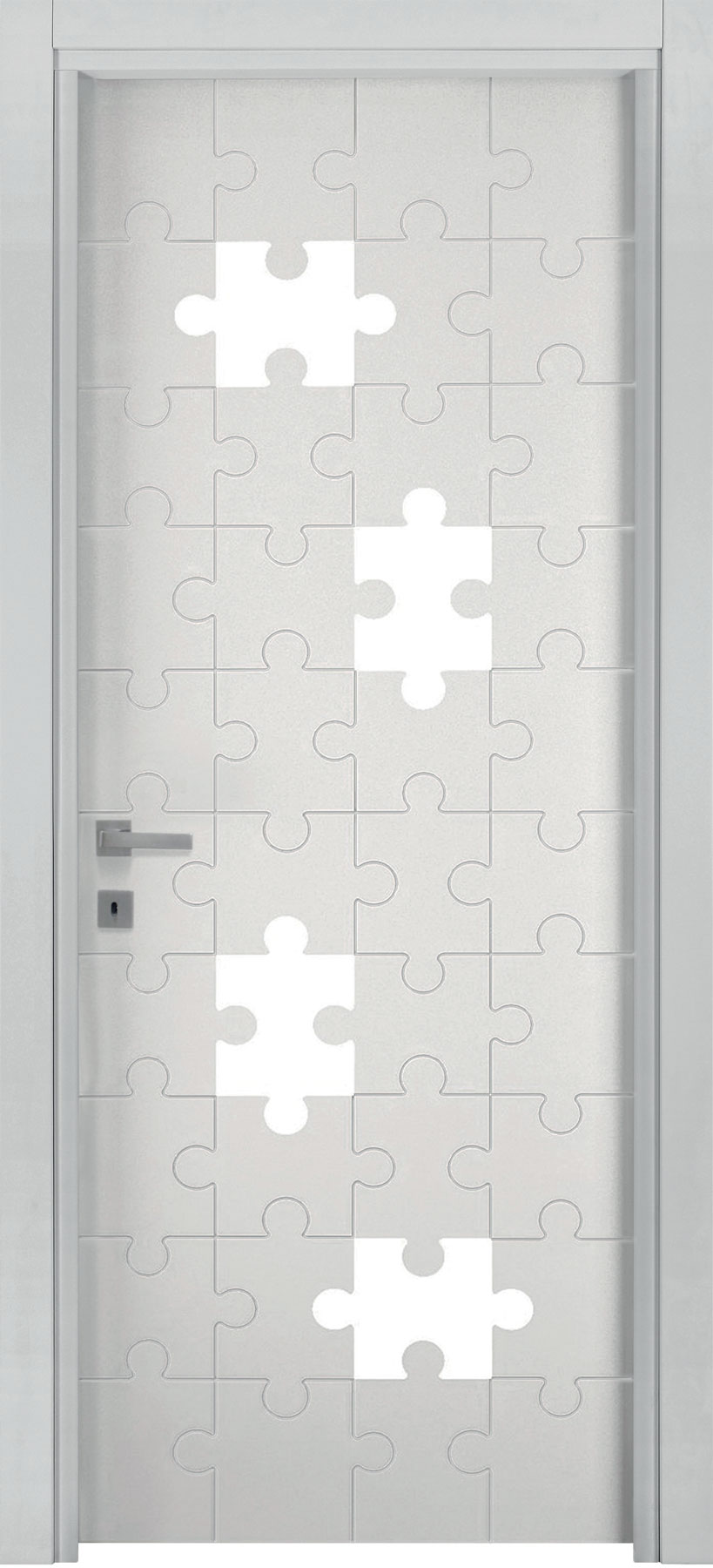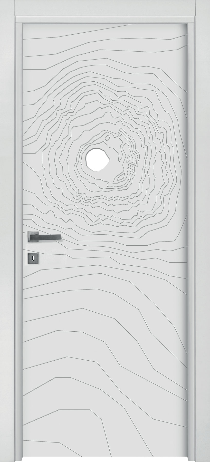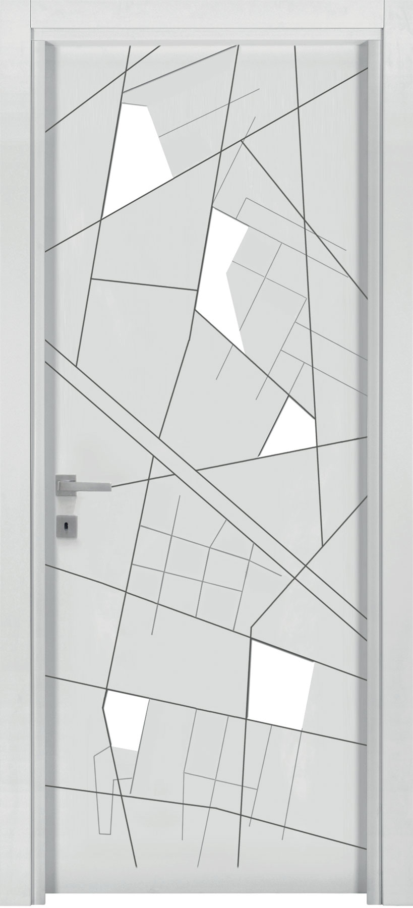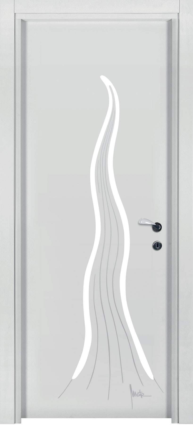 La porta si presenta come un pannello attraversato dalla luce che può assumere ogni forma e dimensione grazie alle svuotature praticate su di esso e al vetro ad infilo. Le possibilità di personalizzazione sono infinite, potendo contare sulle svuotature ma anche su pantografature a diverse profondità, su applicazioni sul pannello e sul vetro di materiali e finiture anche differenti da quelli del pannello porta, su vetri di differenti tipologie e colorazione.