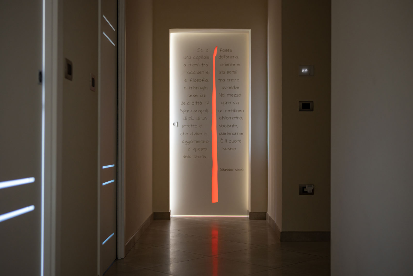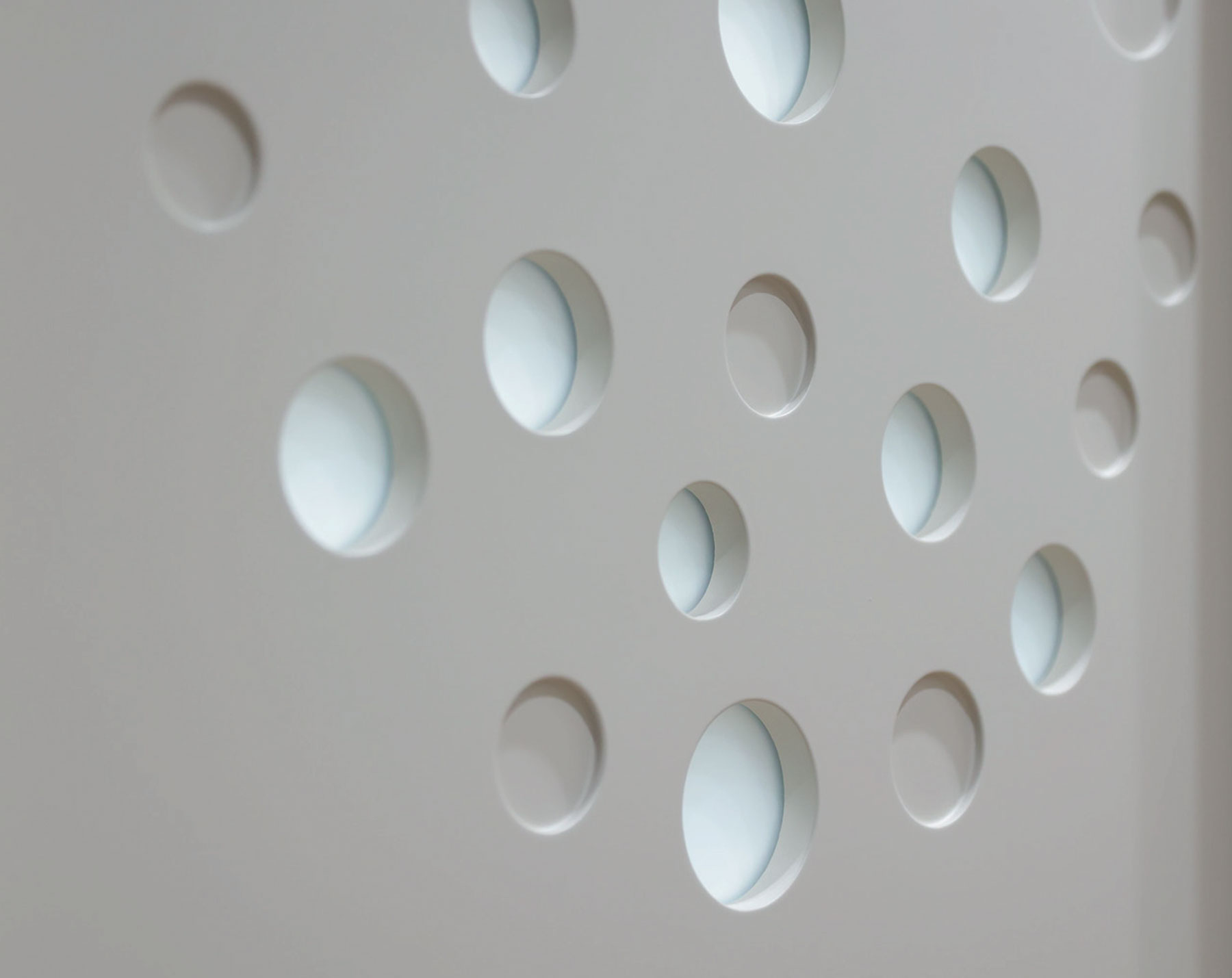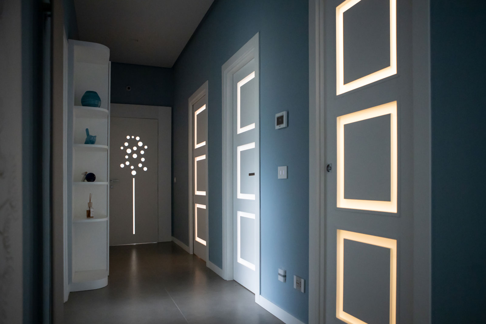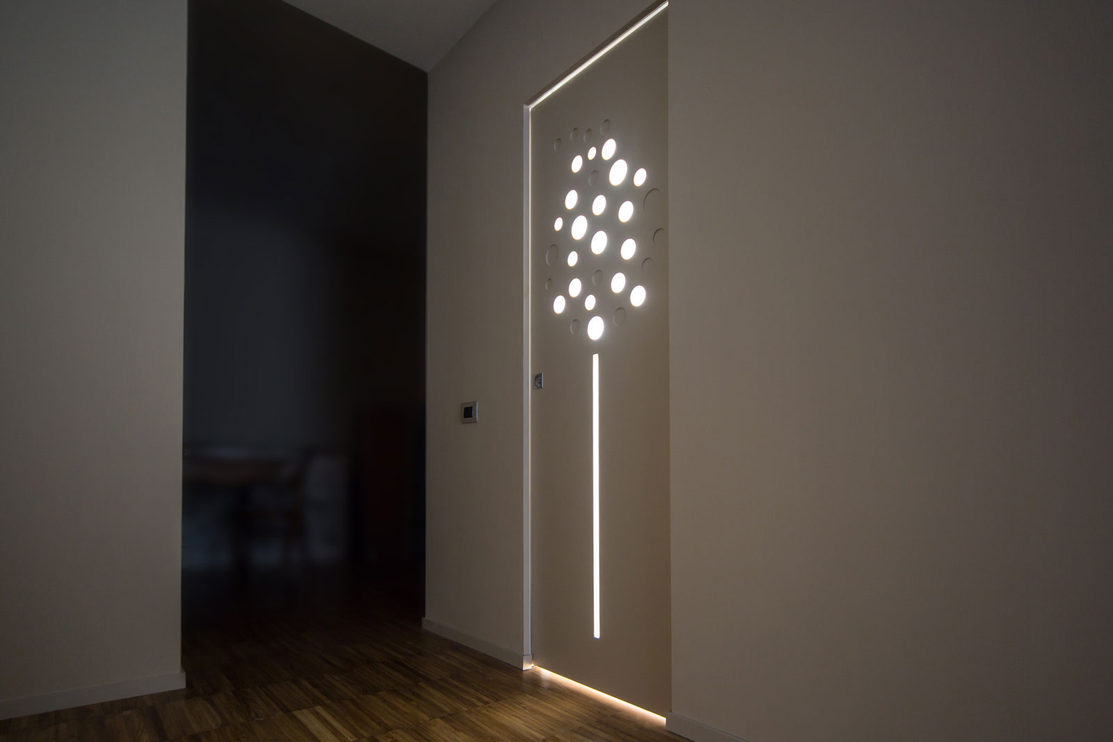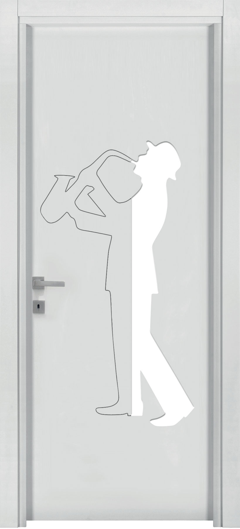 La porta si presenta come un pannello attraversato dalla luce che può assumere ogni forma e dimensione grazie alle svuotature praticate su di esso e al vetro ad infilo. Le possibilità di personalizzazione sono infinite, potendo contare sulle svuotature ma anche su pantografature a diverse profondità, su applicazioni sul pannello e sul vetro di materiali e finiture anche differenti da quelli del pannello porta, su vetri di differenti tipologie e colorazione.