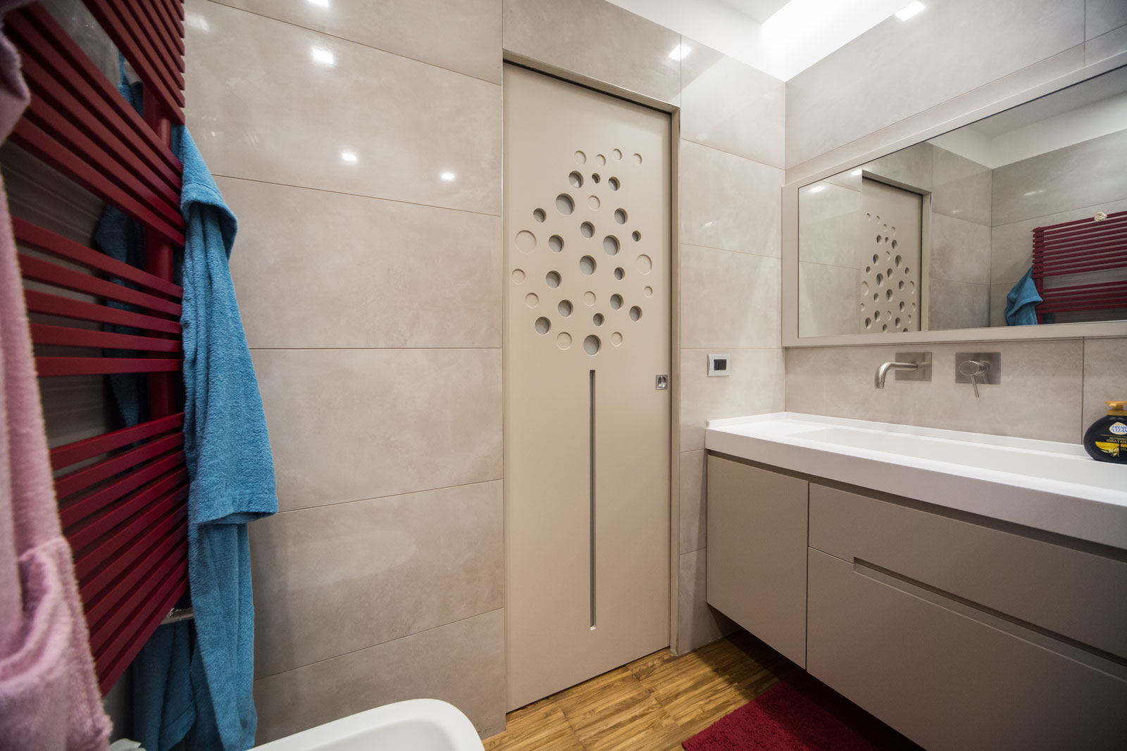 La serratura per la porta scorrevole ha il tirante a filo integrato anziché il tradizionale ditale di trascinamento, per un miglior risultato estetico e funzionale.