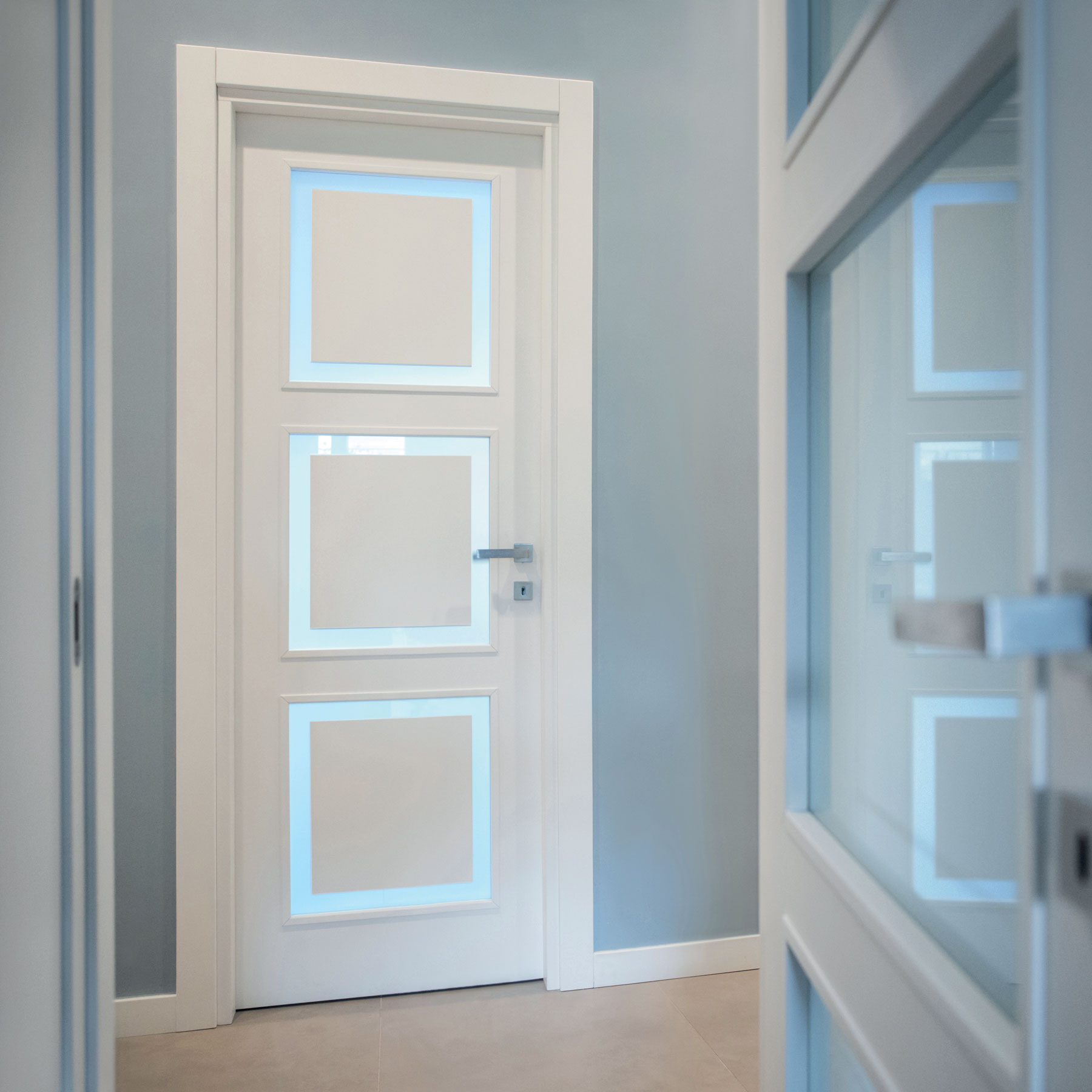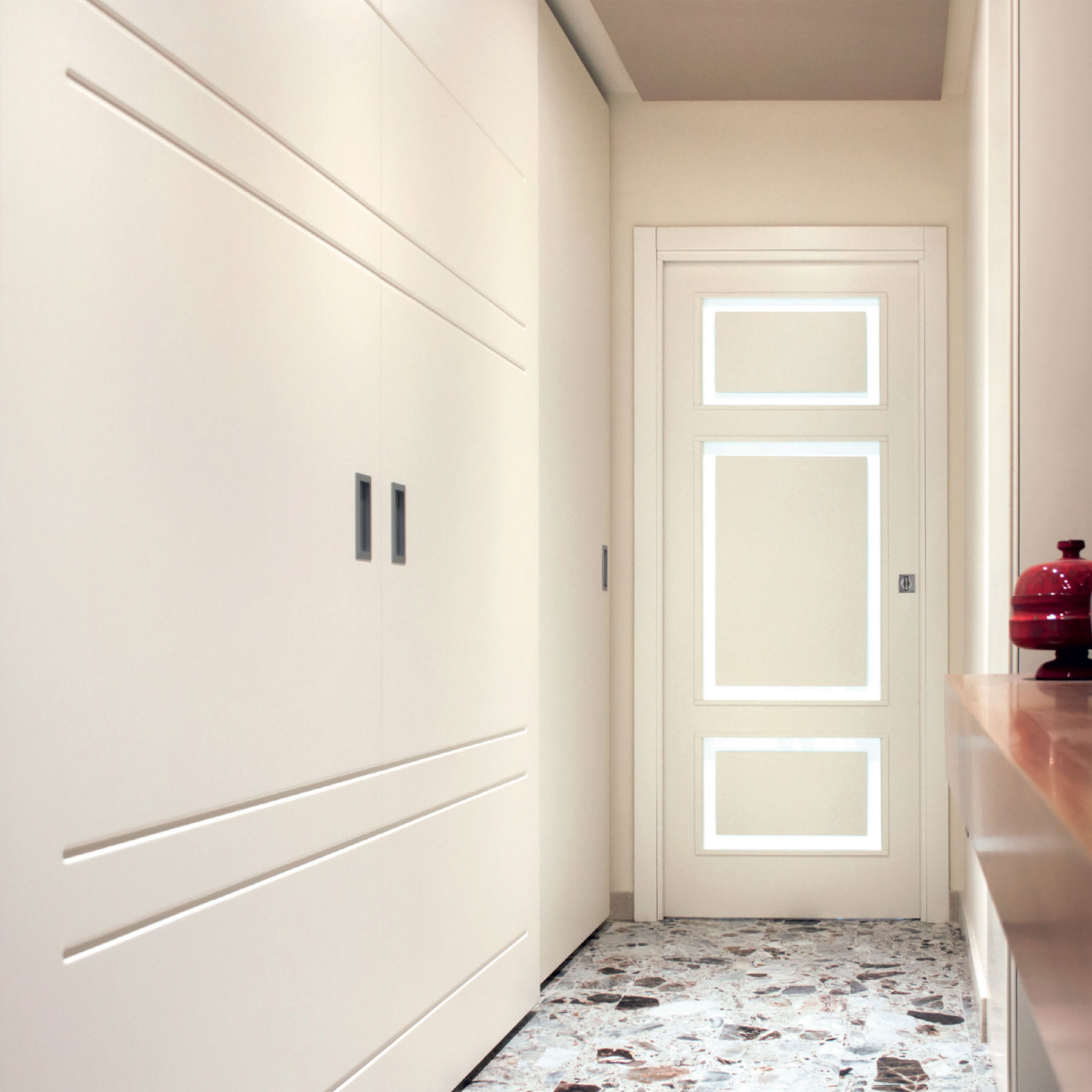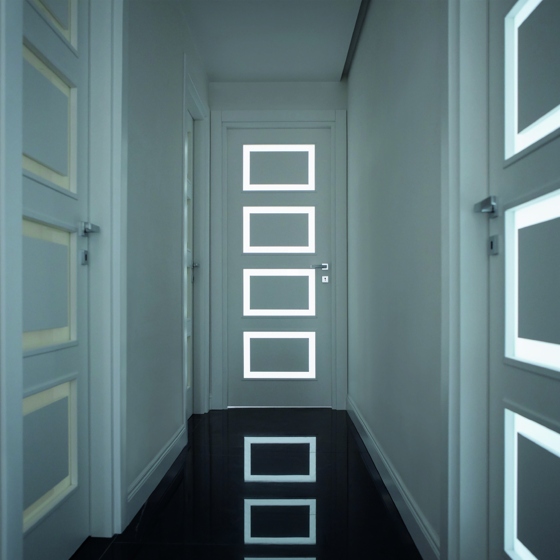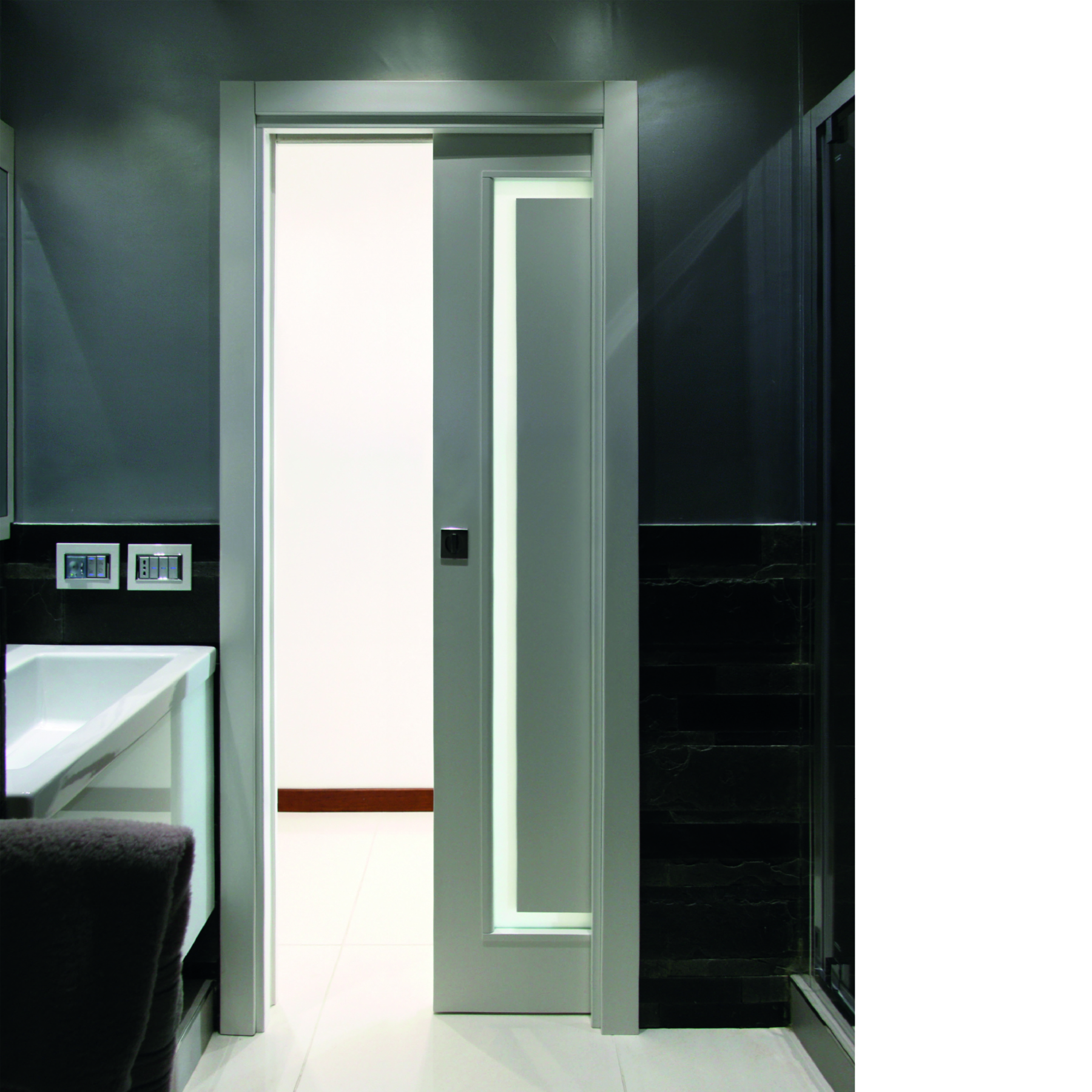 Le caratteristiche esclusive dei pannelli porta sono il risultato di una progettazione appositamente concepita per le diverse tipologie di apertura, evitando la produzione di prodotti standard adattati successivamente. Quest’attenzione, combinata alle lavorazioni in azienda di telai e coprifili, permette di evitare approssimazioni e inestetismi, che spesso caratterizzano altri prodotti presenti sul mercato. Un esempio eclatante è quello delle porte scorrevoli a scomparsa, che presentano differenze di altezza tra vano passaggio e coprifili rispetto alle battenti; inoltre il disegno dell’anta perde la sua geometria e simmetria essendo nascosto dietro al telaietto.