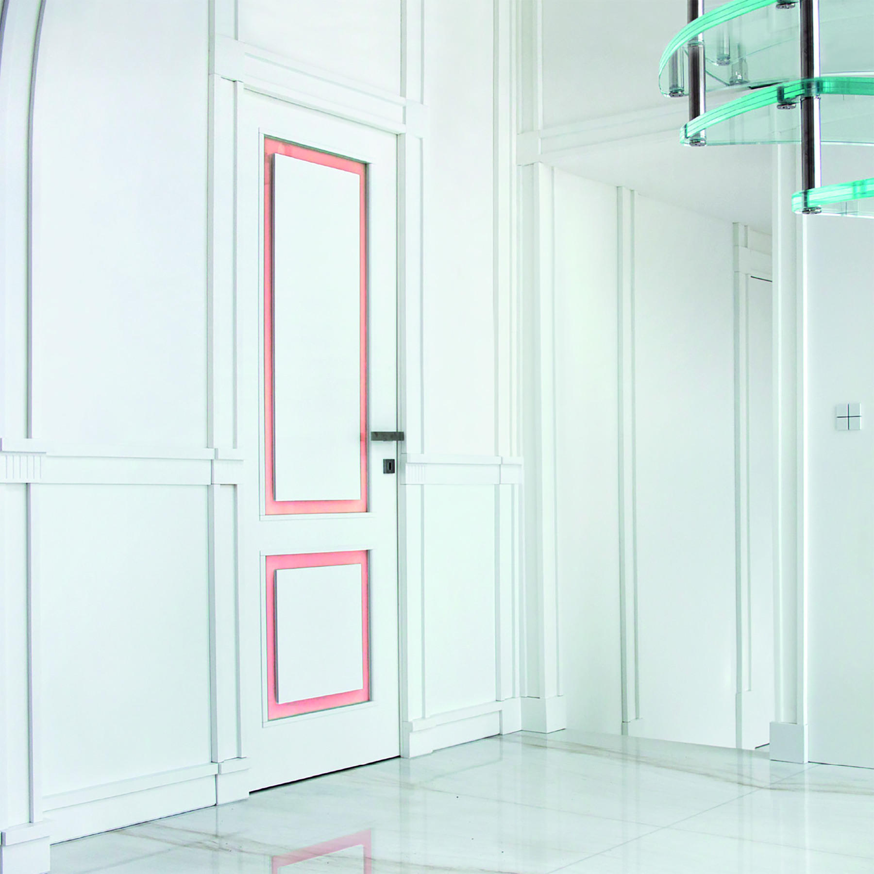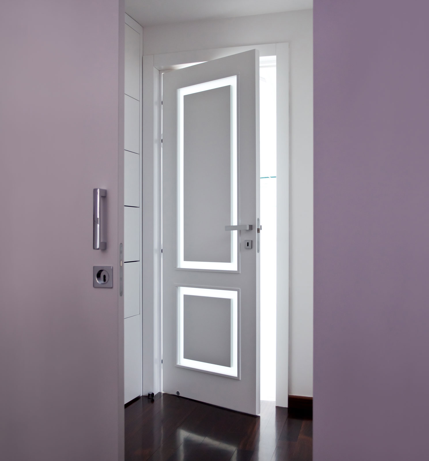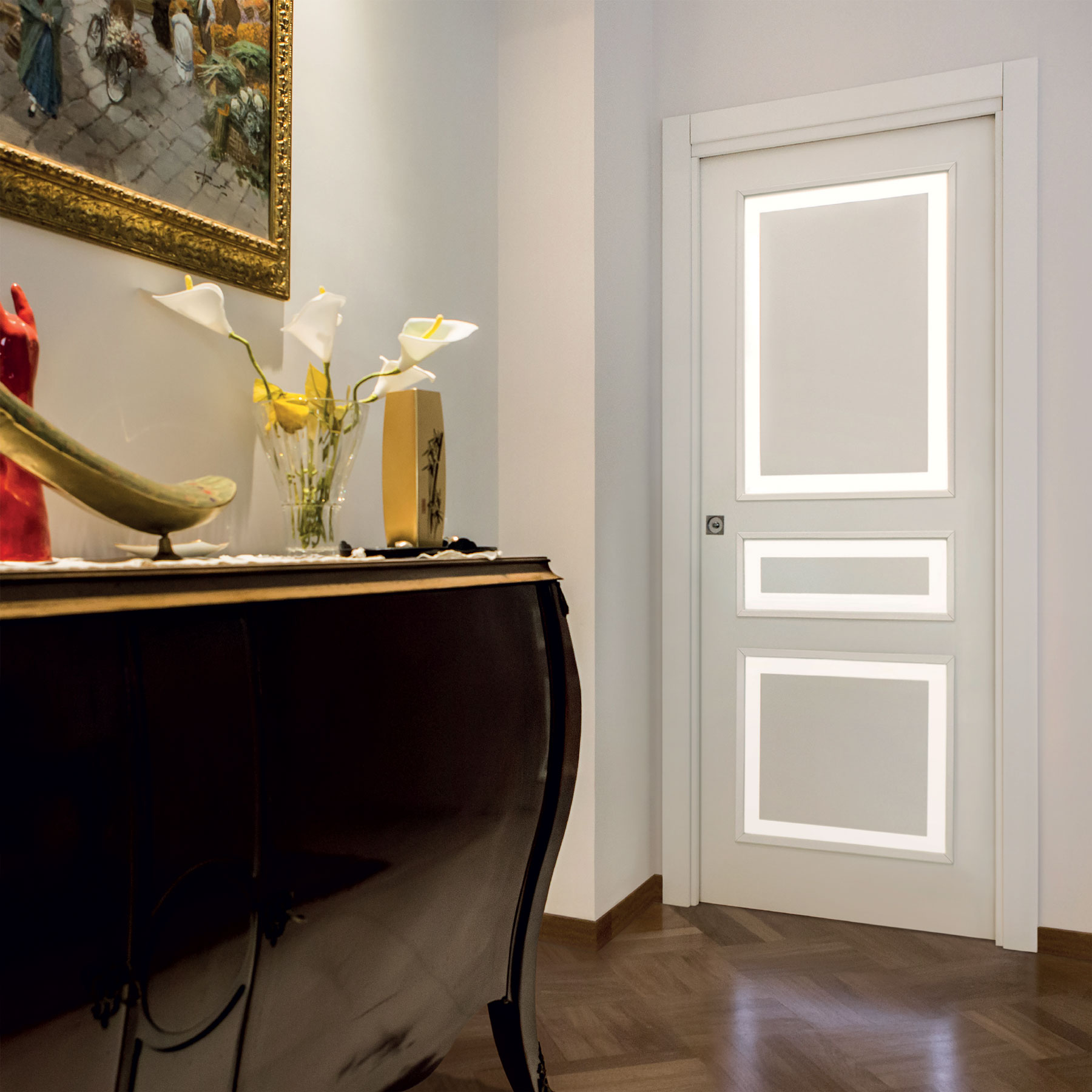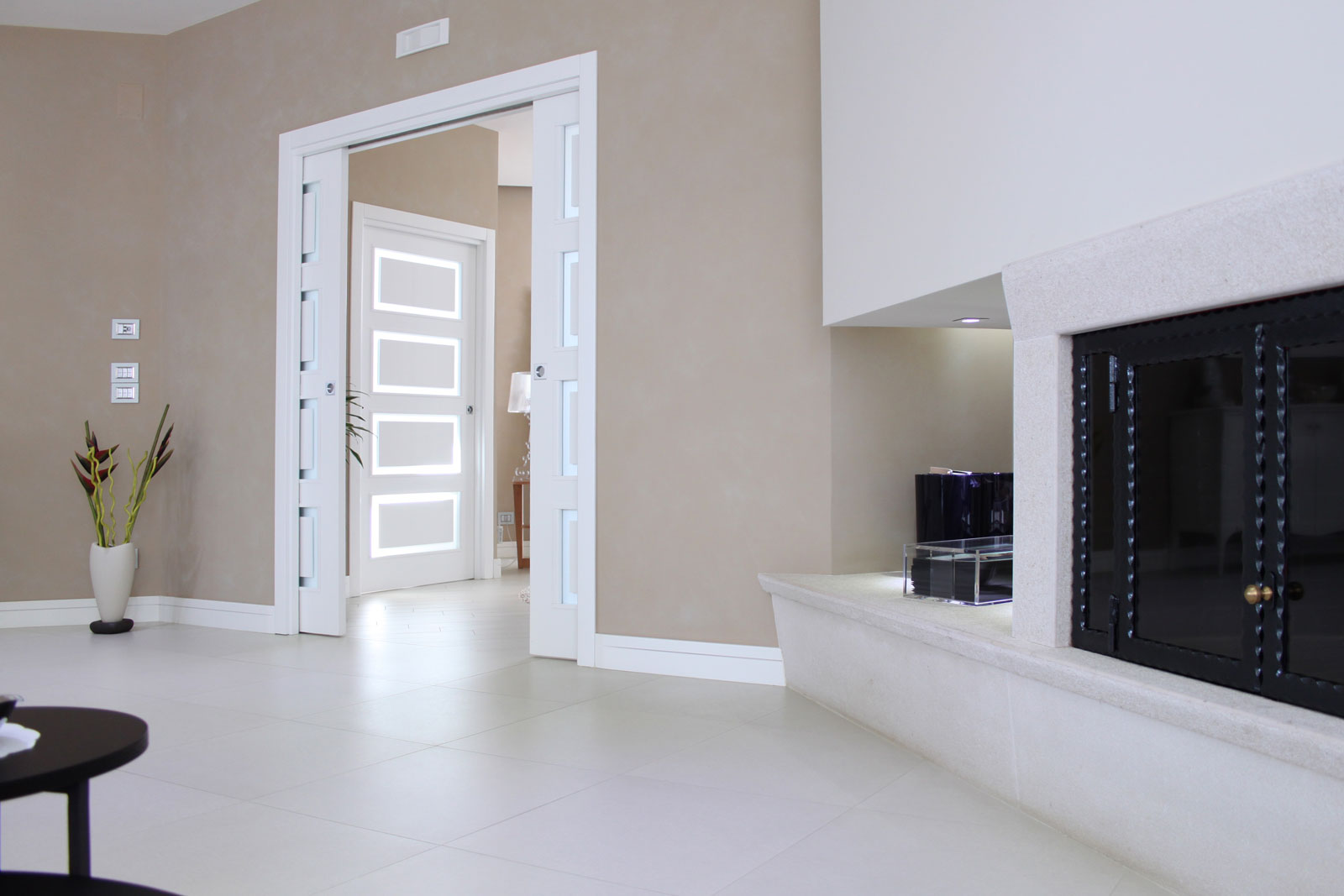 Le caratteristiche esclusive dei pannelli porta sono il risultato di una progettazione appositamente concepita per le diverse tipologie di apertura, evitando la produzione di prodotti standard adattati successivamente. Quest’attenzione, combinata alle lavorazioni in azienda di telai e coprifili, permette di evitare approssimazioni e inestetismi, che spesso caratterizzano altri prodotti presenti sul mercato. Un esempio eclatante è quello delle porte scorrevoli a scomparsa, che presentano differenze di altezza tra vano passaggio e coprifili rispetto alle battenti; inoltre il disegno dell’anta perde la sua geometria e simmetria essendo nascosto dietro al telaietto.