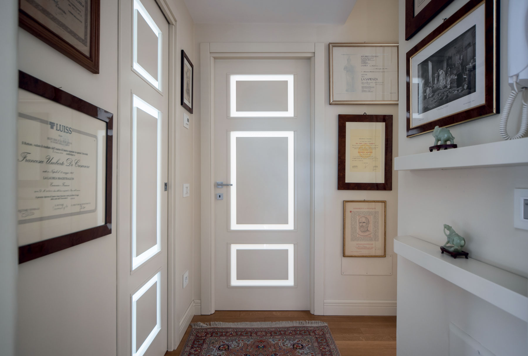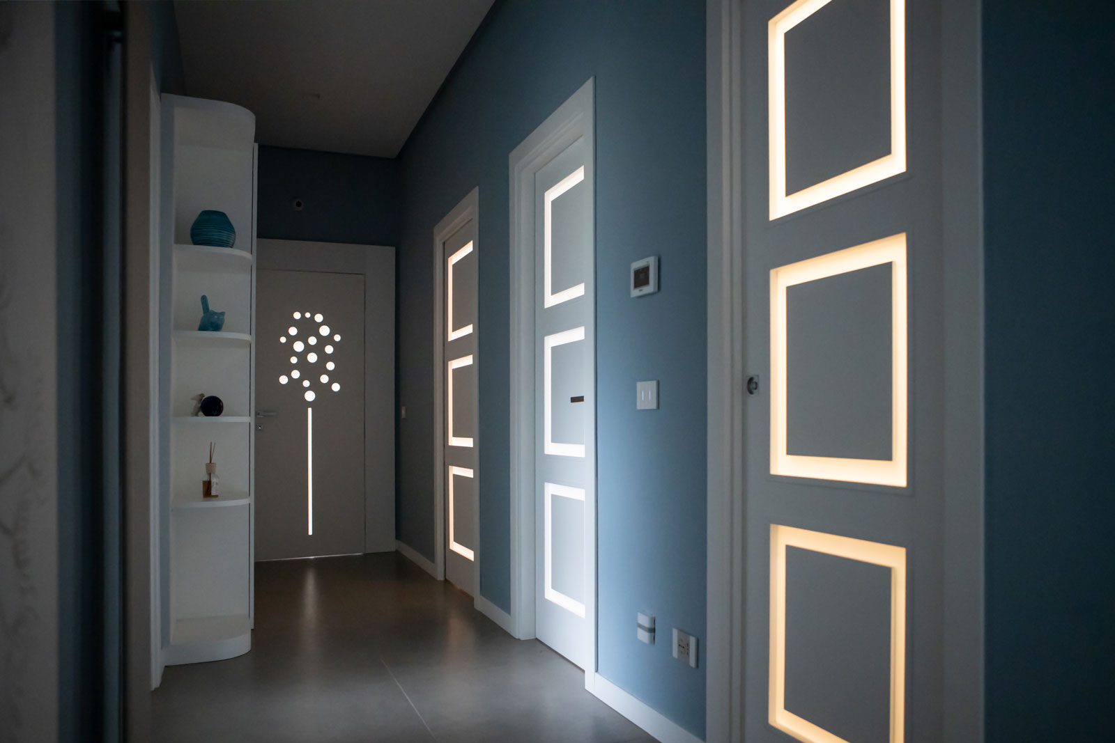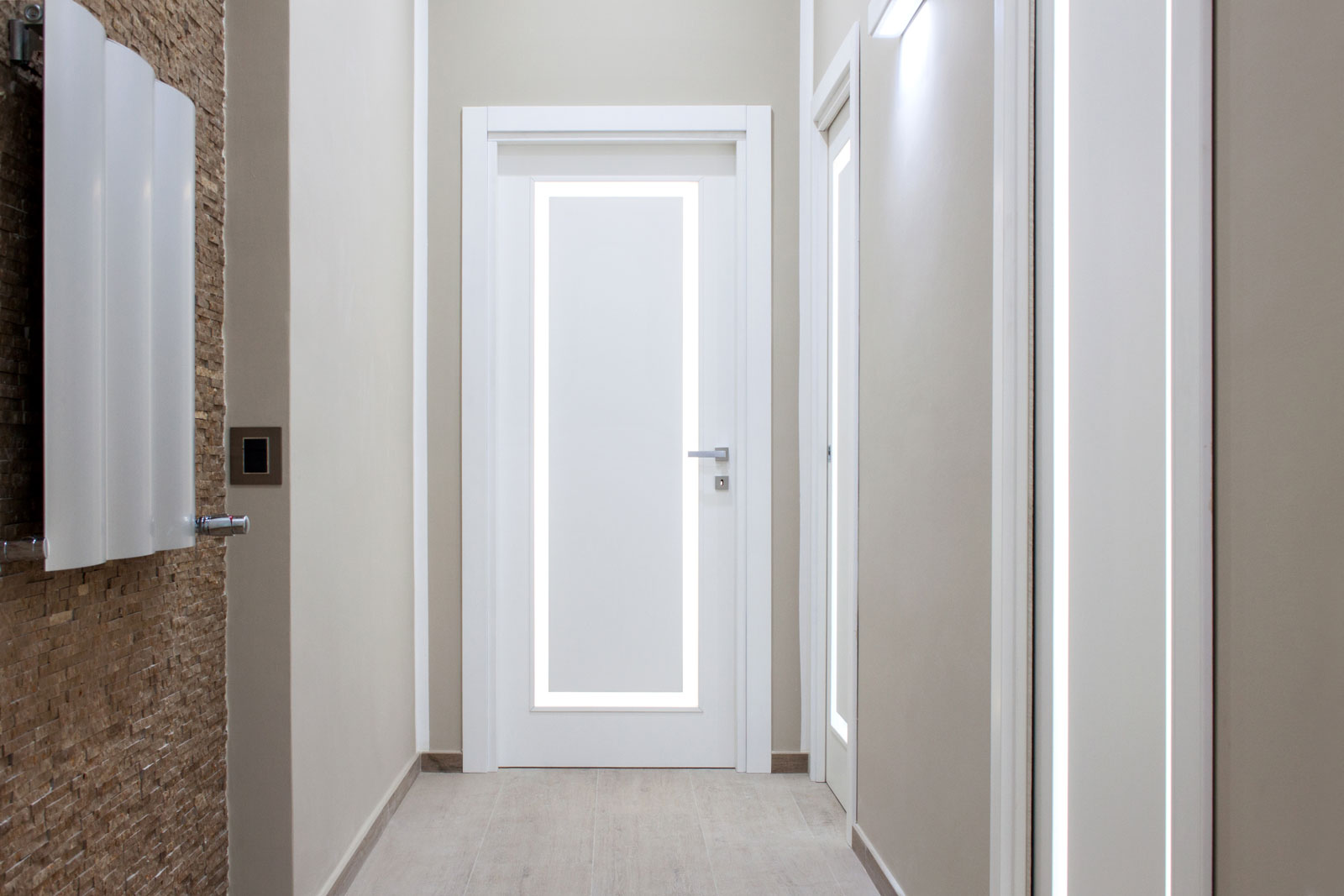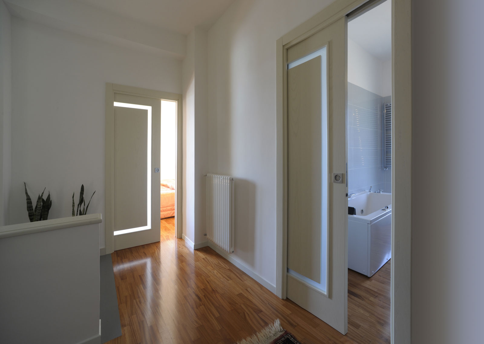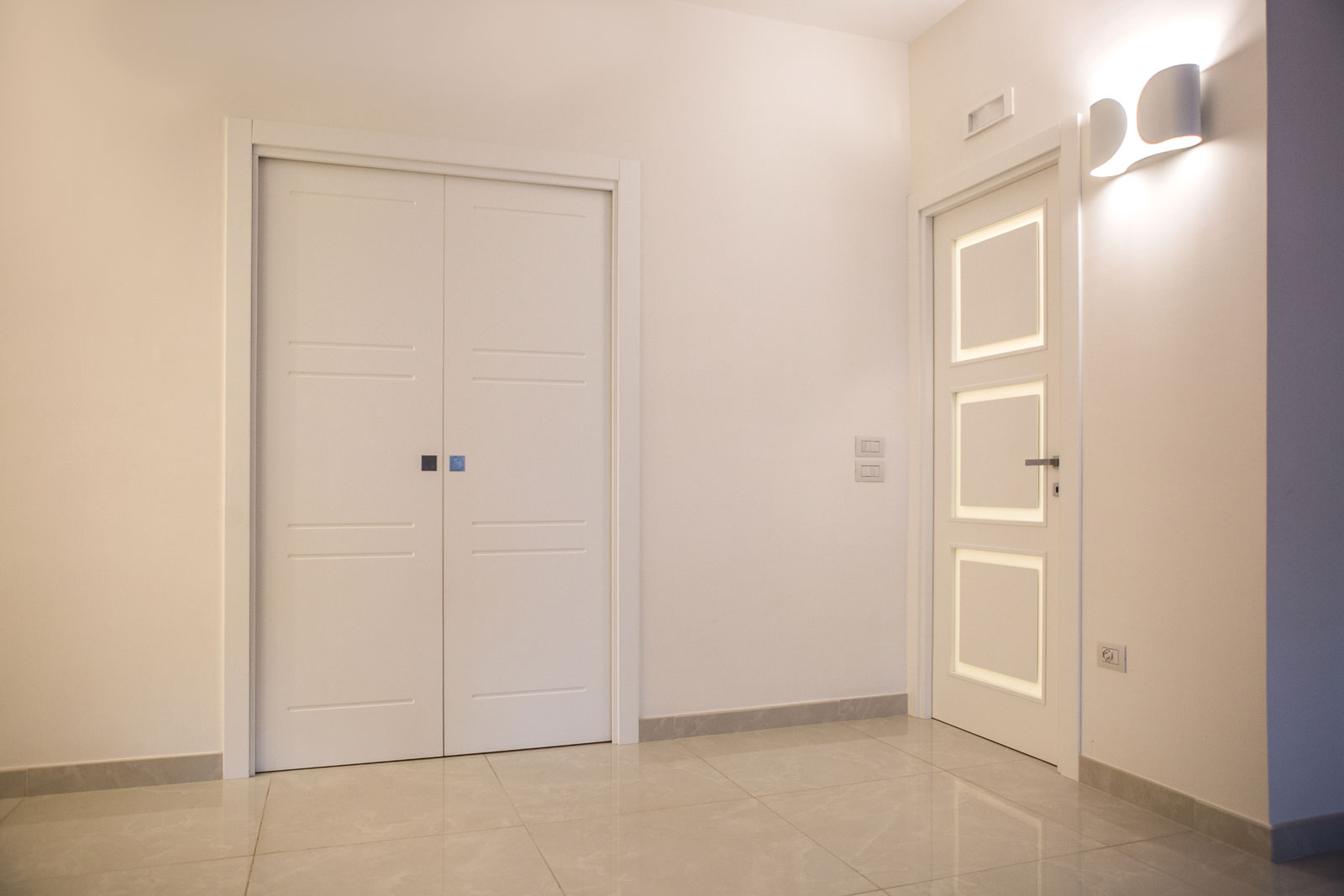 Le caratteristiche esclusive dei pannelli porta sono il risultato di una progettazione appositamente concepita per le diverse tipologie di apertura, evitando la produzione di prodotti standard adattati successivamente. Quest’attenzione, combinata alle lavorazioni in azienda di telai e coprifili, permette di evitare approssimazioni e inestetismi, che spesso caratterizzano altri prodotti presenti sul mercato. Un esempio eclatante è quello delle porte scorrevoli a scomparsa, che presentano differenze di altezza tra vano passaggio e coprifili rispetto alle battenti; inoltre il disegno dell’anta perde la sua geometria e simmetria essendo nascosto dietro al telaietto.