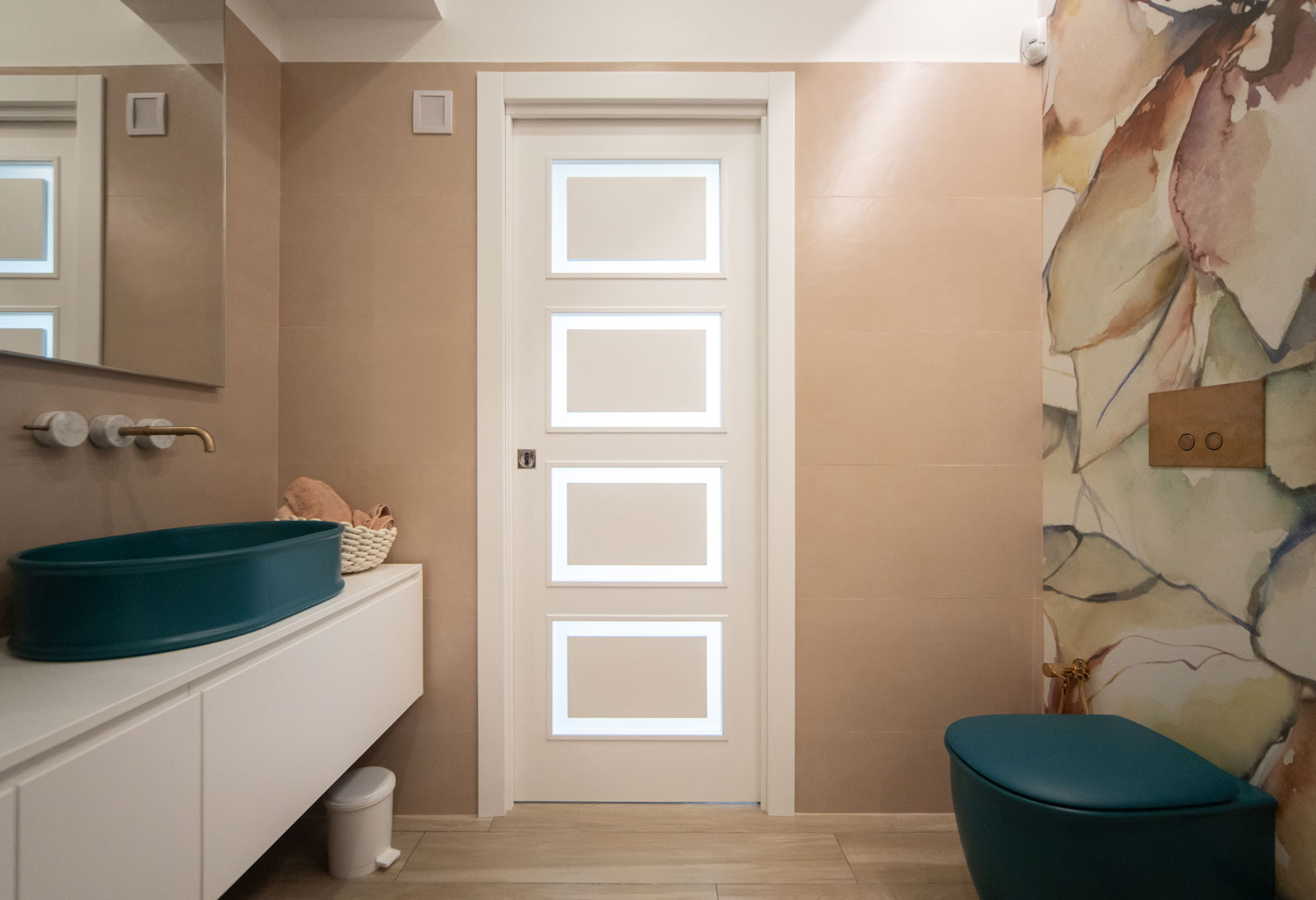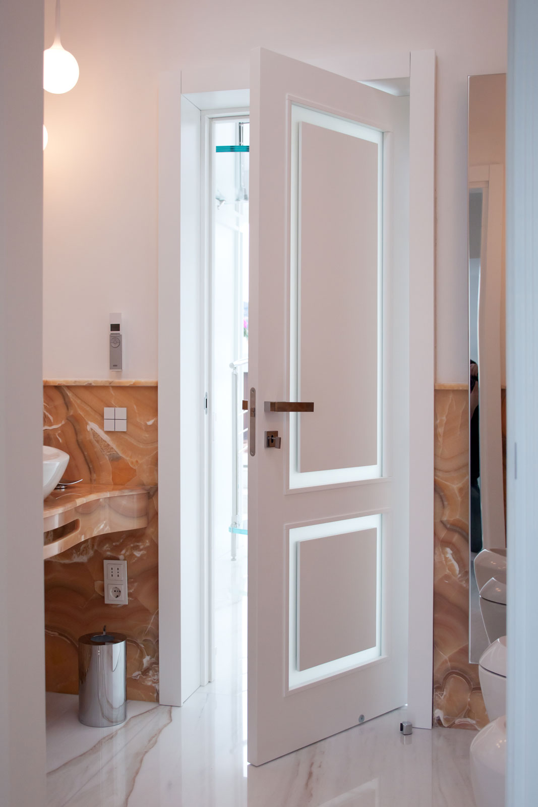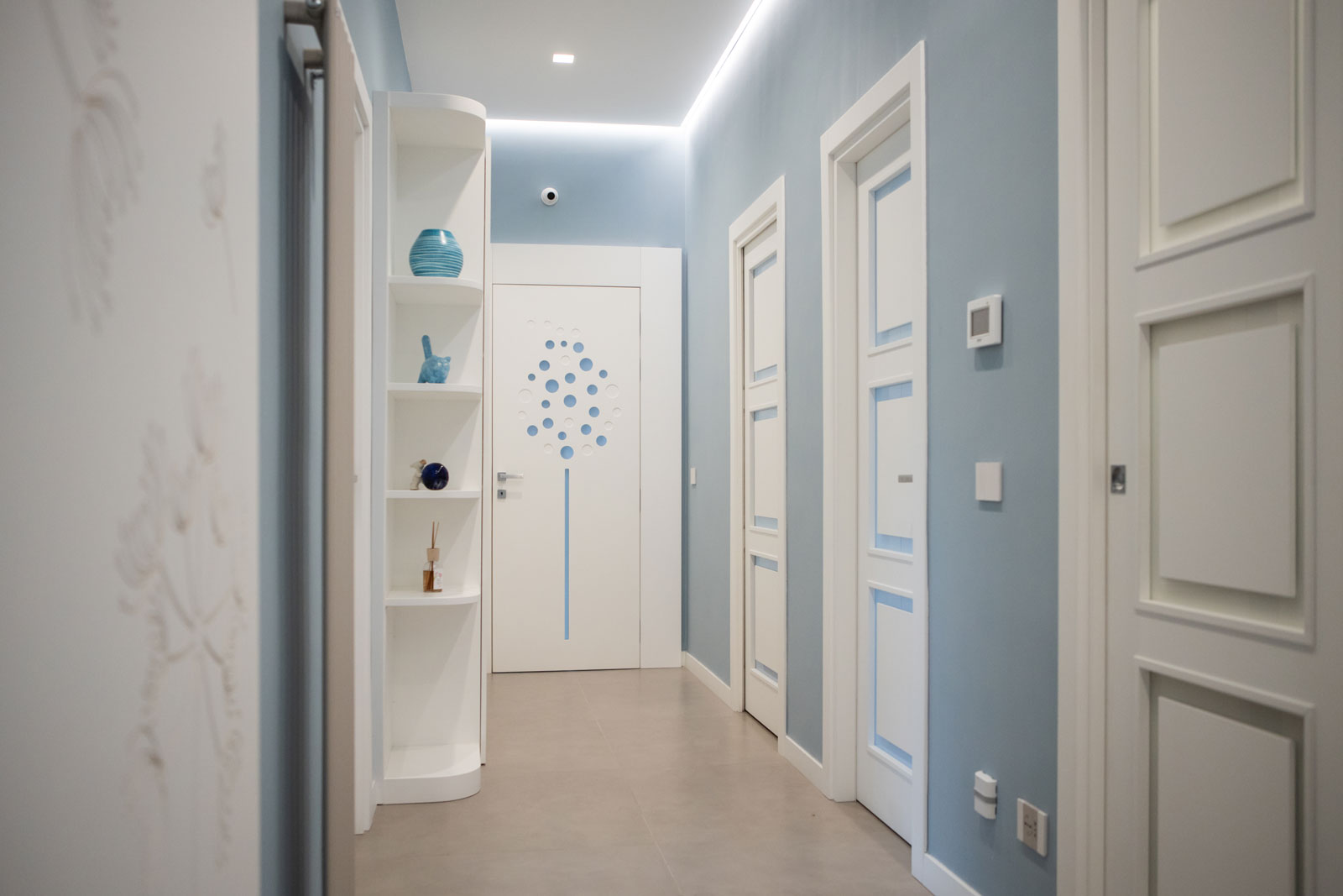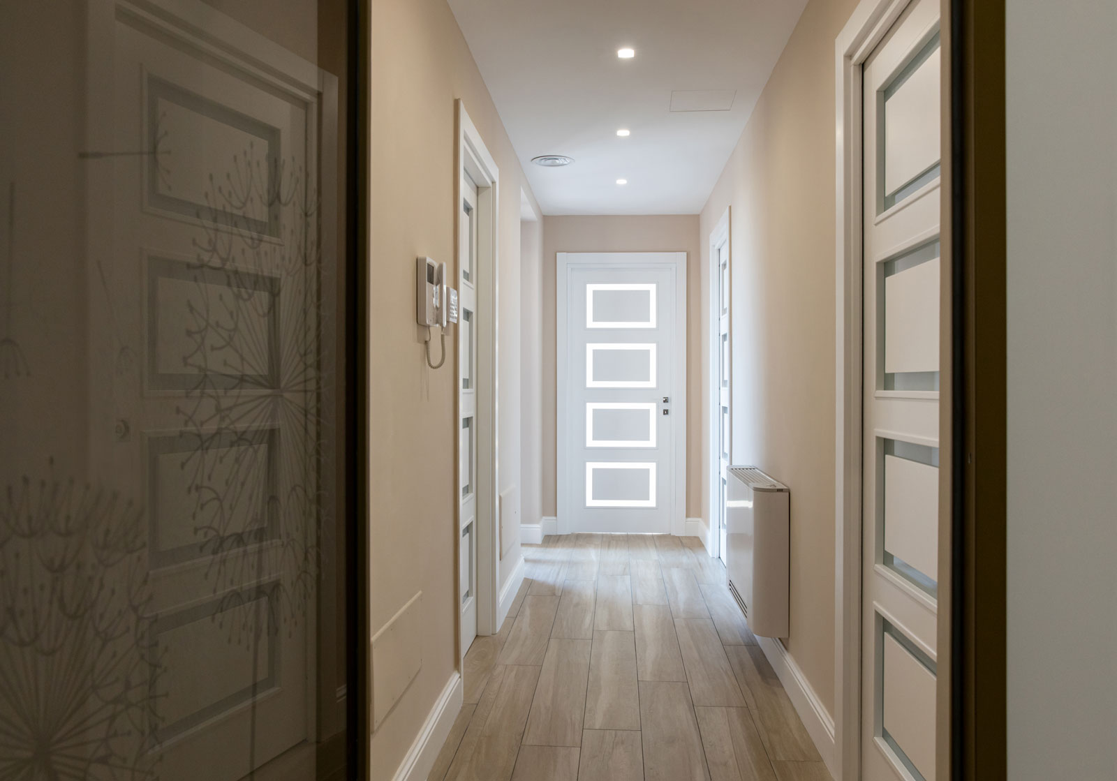 Le caratteristiche esclusive dei pannelli porta sono il risultato di una progettazione appositamente concepita per le diverse tipologie di apertura, evitando la produzione di prodotti standard adattati successivamente. Quest’attenzione, combinata alle lavorazioni in azienda di telai e coprifili, permette di evitare approssimazioni e inestetismi, che spesso caratterizzano altri prodotti presenti sul mercato. Un esempio eclatante è quello delle porte scorrevoli a scomparsa, che presentano differenze di altezza tra vano passaggio e coprifili rispetto alle battenti; inoltre il disegno dell’anta perde la sua geometria e simmetria essendo nascosto dietro al telaietto.
