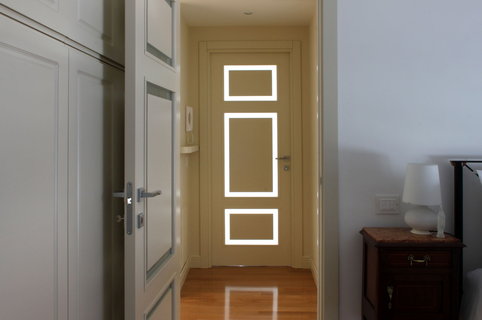 Originale, unica, brevettata, la Jewel® Design è caratterizzata dall’innovativo sistema “Light Trough”. La bugna è sostituita dal vetro con la luce che ne scandisce le geometrie: linee luminose creano effetti luce che conferiscono ad una porta dalle forme tradizionali, un taglio inedito e contemporaneo.