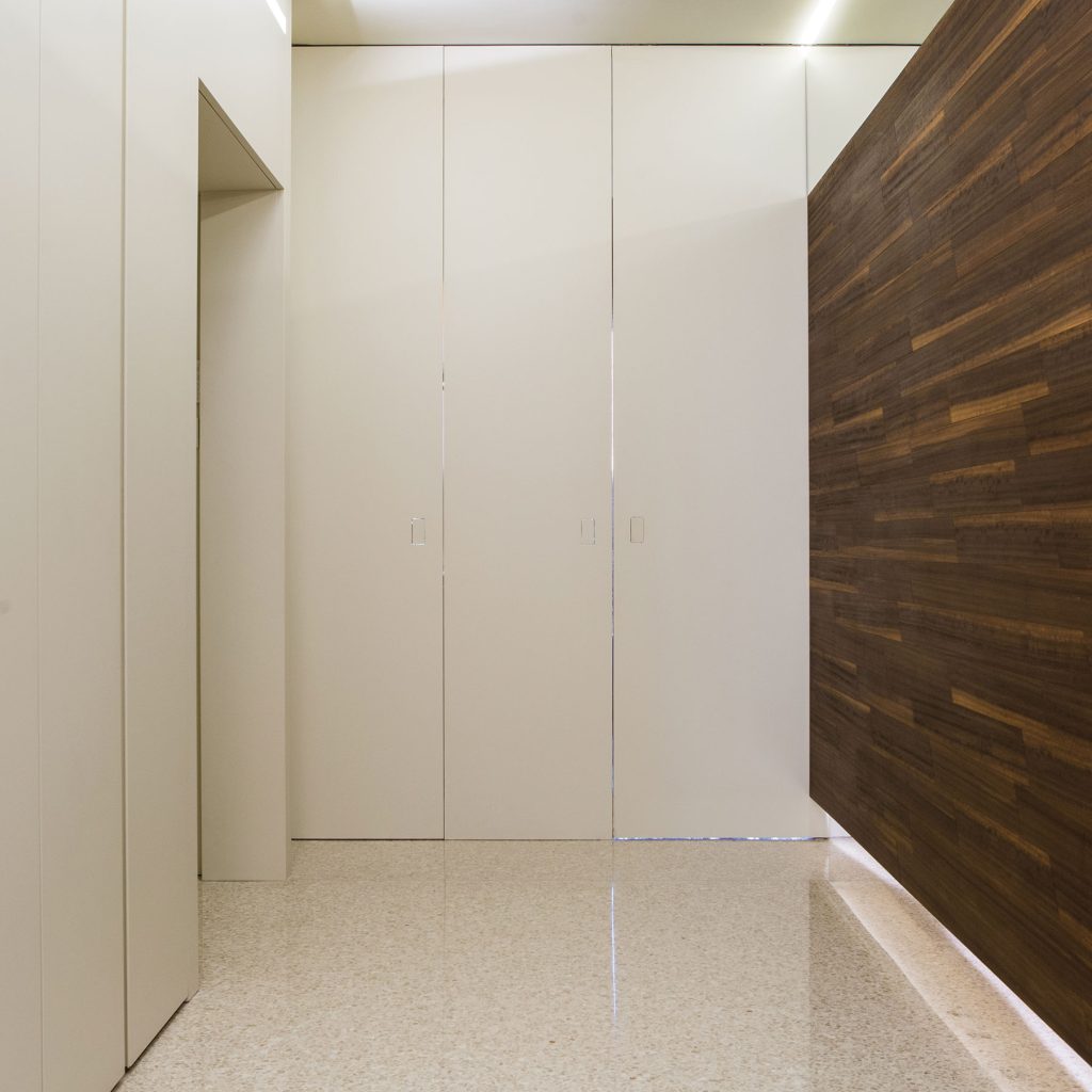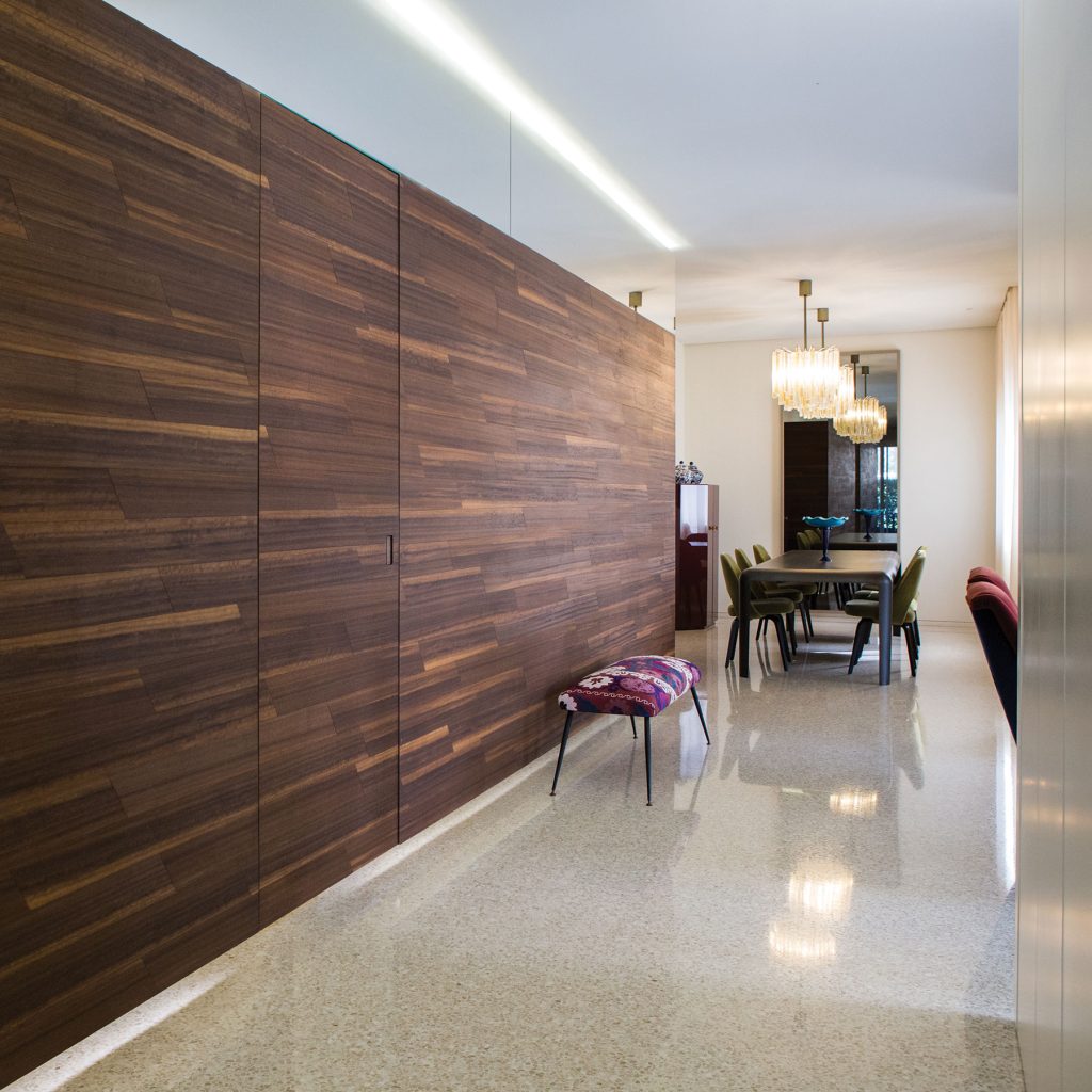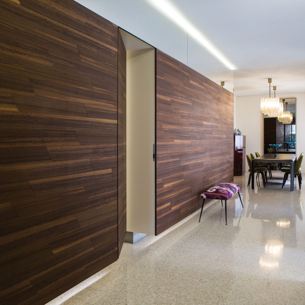 Per integrare completamente la porta nella parete e dare continuità all’ambiente.