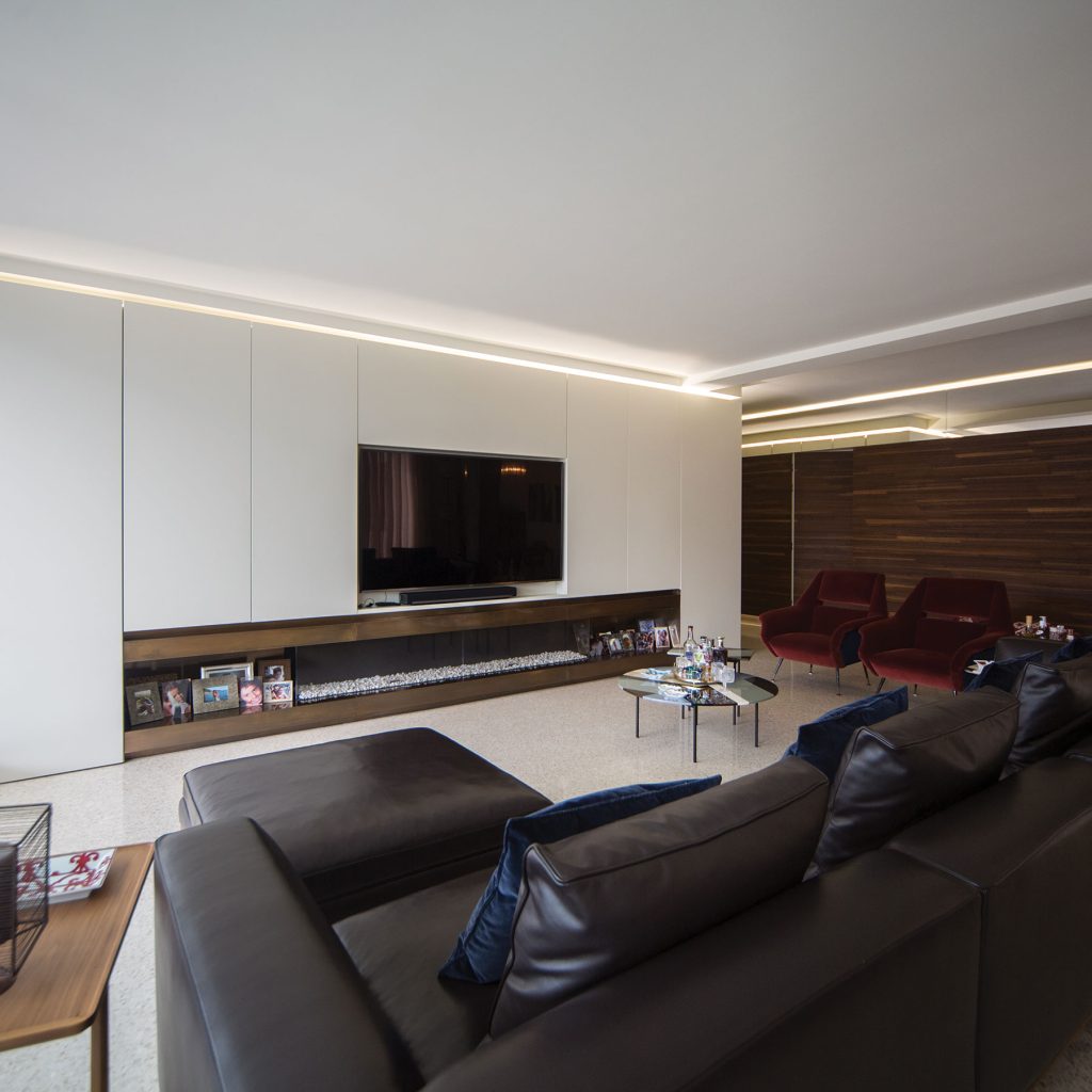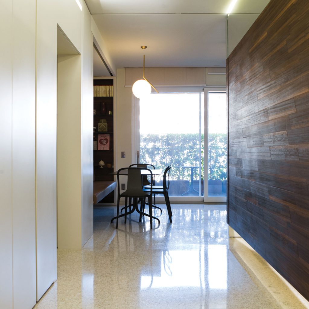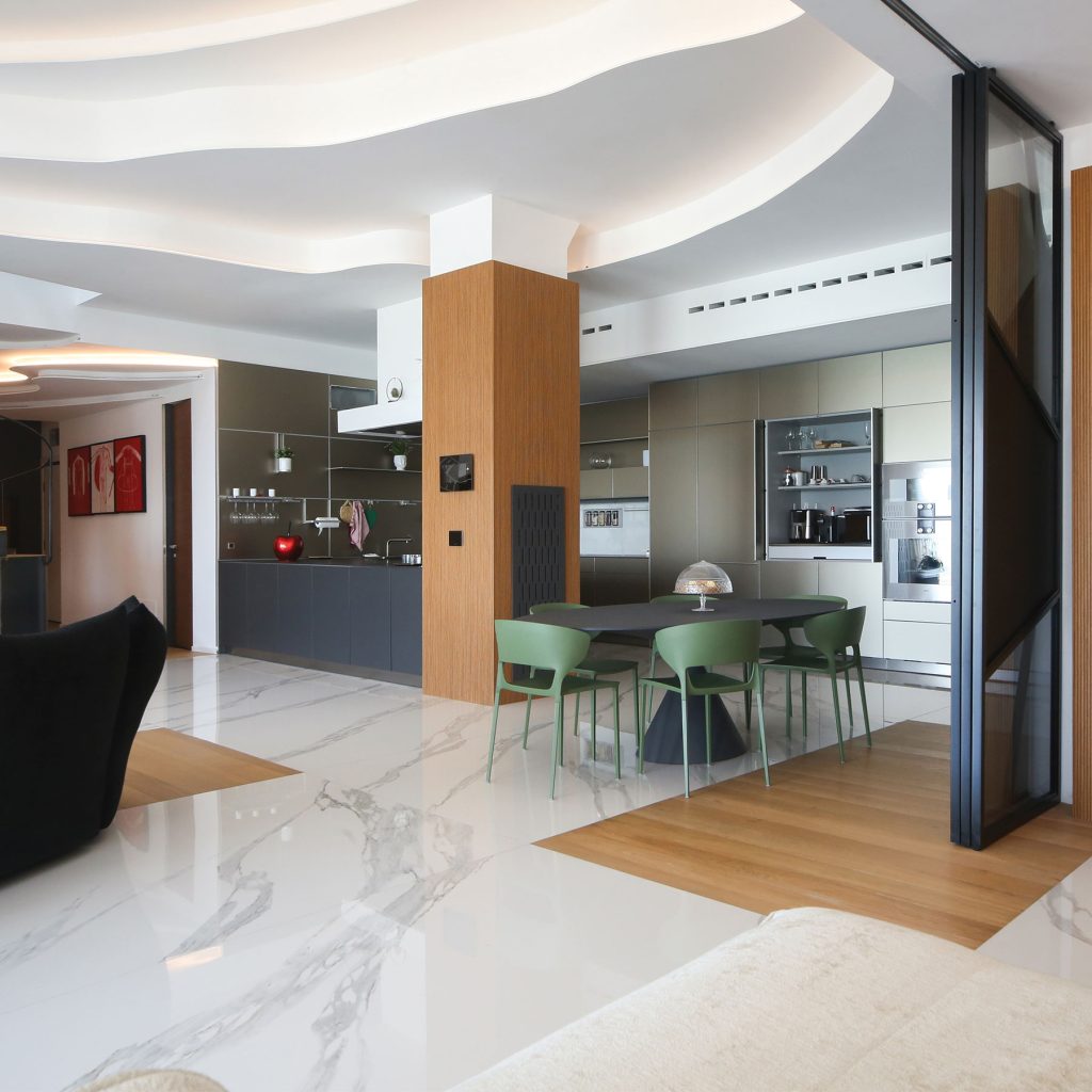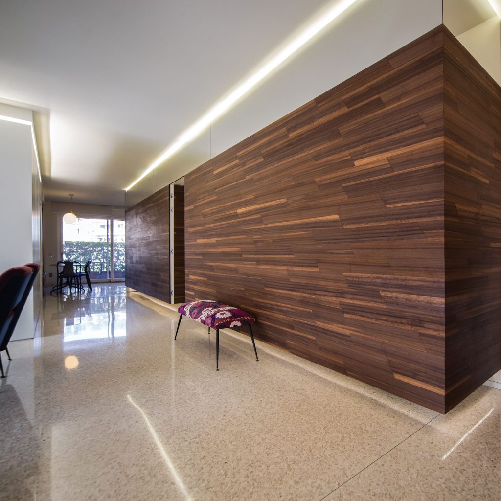 Per integrare completamente la porta nella parete e dare continuità all’ambiente.