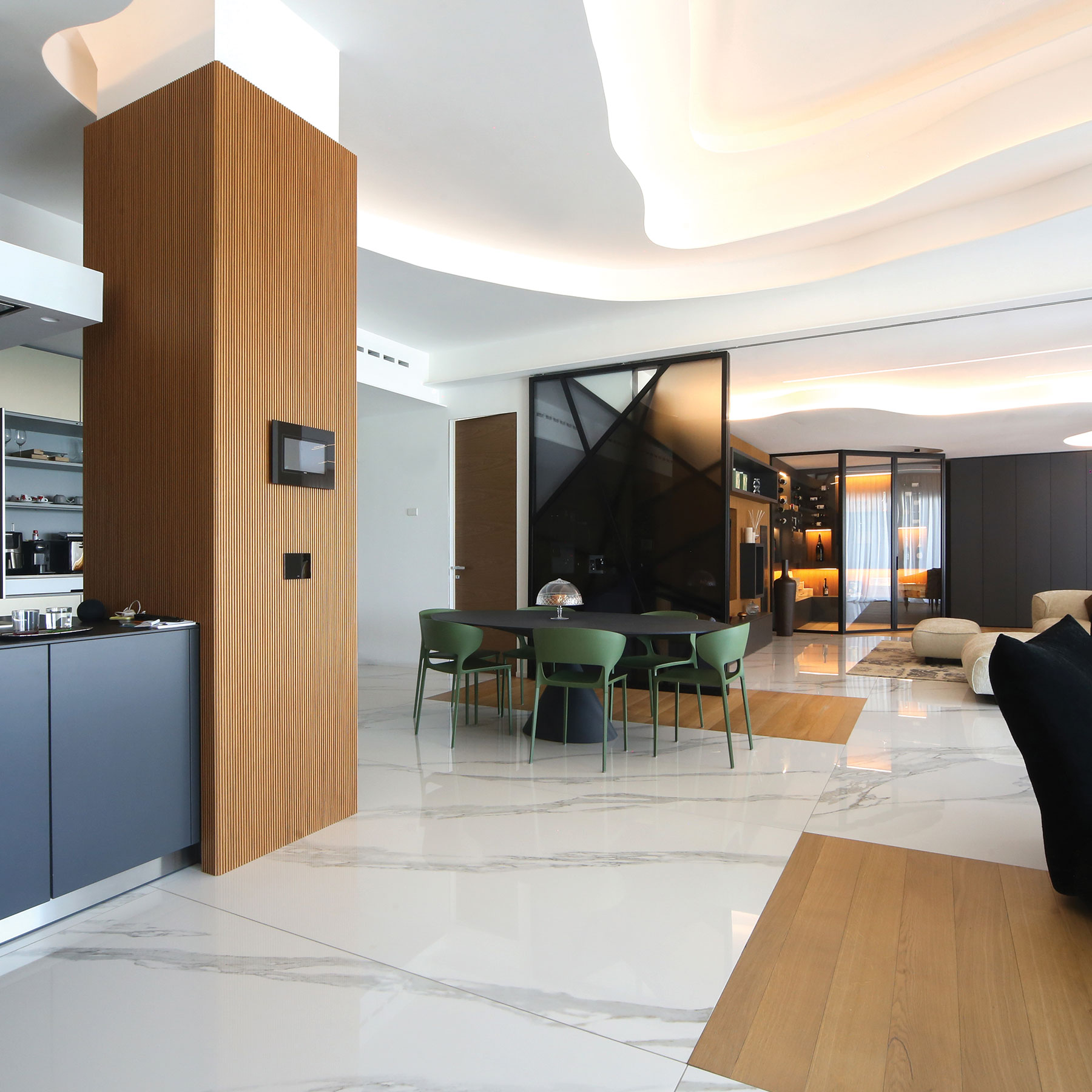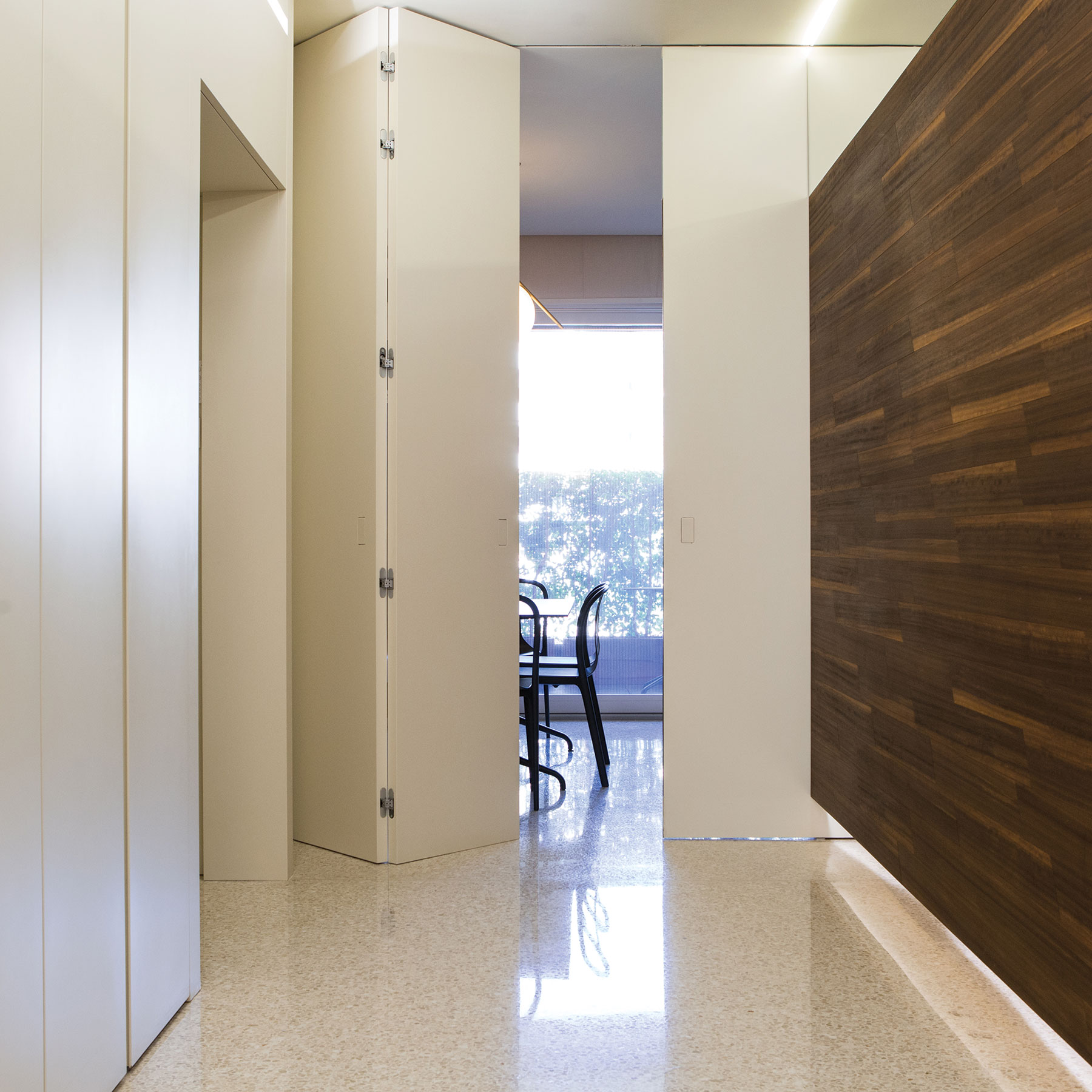 Per integrare completamente la porta nella parete e dare continuità all’ambiente.